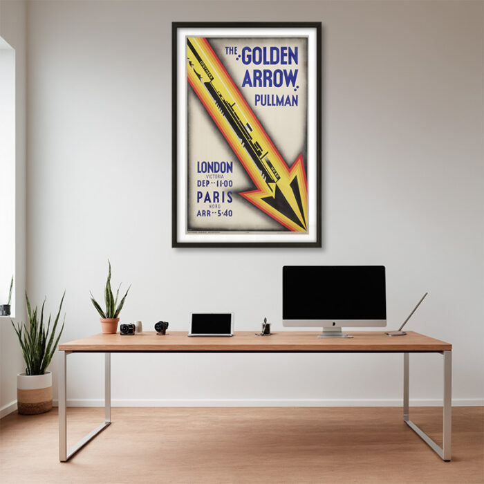 This 1931 poster by Charles Shephard promotes the Golden Arrow Pullman service. A luxury train route between London and Paris. A refined and elegant piece for rail travel collectors.