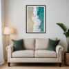 This beachscape art print presents an aerial view of vivid turquoise waves crashing onto golden sand — creating striking foam patterns. For admirers of sea-inspired decor. Bring fresh coastal energy to your wall. Prints available in A1, A2, A3 and A4 sizes.