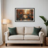 This wall art print captures a misty European canal at dusk, with an illuminated arched bridge and golden streetlights reflecting on the water. For travel fans and lovers of timeless European charm. Bring a sense of evening magic to your wall. Prints available in A1, A2, A3 and A4 sizes.