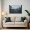 This nature and landscape print depicts a fog-shrouded forest of towering pine trees with distant mountains fading into the mist. For lovers of deep forest moods and atmospheric art. Let quiet forest mystery breathe on your wall. Prints available in A1, A2, A3 and A4 sizes.