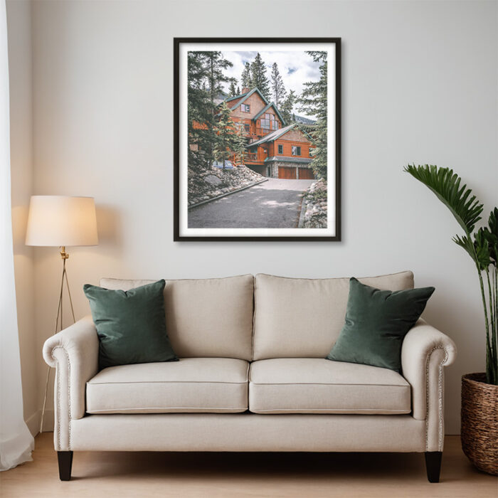 This poster print presents a grand Forest Lodge-style cabin with timber and stone detailing, nestled among tall pines. For admirers of alpine retreats. Add the spirit of a woodland lodge to your wall. Prints available in A1, A2, A3 and A4 sizes.