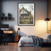 This Halloween vintage poster depicts an old house beneath autumn trees — a black cat, jack-o’-lanterns, and a pumpkin-headed scarecrow completing the eerie scene. For admirers of haunting rustic beauty. Let timeless Halloween magic adorn your wall. Prints available in A1, A2, A3 and A4 sizes.