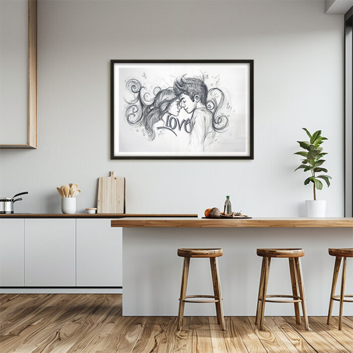 This love-themed poster features a soft pencil sketch of a couple gently touching foreheads, LOVE elegantly written beneath. For those drawn to tender moments. Let this touching image grace your wall. Prints available in A1, A2, A3 and A4 sizes.