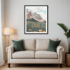 This poster print captures a meadow of vivid orange mountain flowers blanketing a grassy field beneath towering rocky peaks and snow patches. For admirers of wild alpine colour. Let nature’s bold bloom grace your wall. Prints available in A1, A2, A3 and A4 sizes.