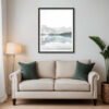 This poster print shows a still mountain lake mirroring pine forests and snow-capped peaks beneath a bright overcast sky. For admirers of untouched wilderness. Bring serene mountain stillness to your wall. Prints available in A1, A2, A3 and A4 sizes.