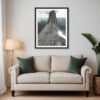 This poster print features a sharp mountain ridge and peak, snow patches and a distant lake beneath swirling clouds. For those drawn to mountain drama. Add alpine heights and wild skies to your wall. Prints available in A1, A2, A3 and A4 sizes.