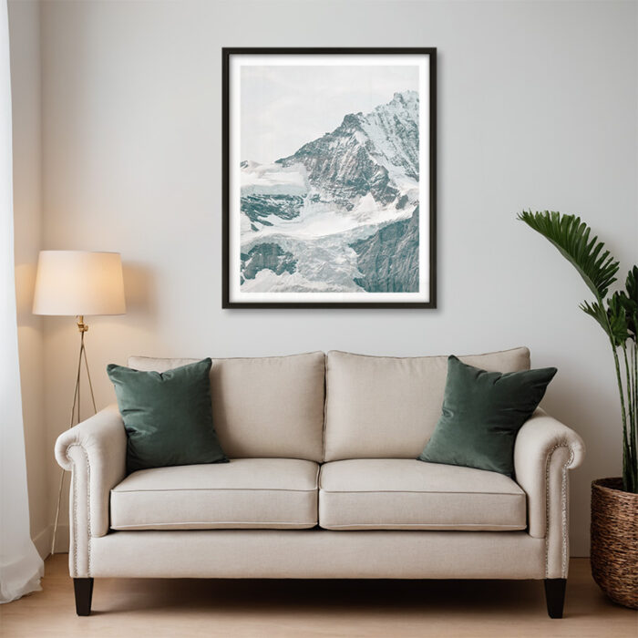 This poster print captures a snow-draped mountain peak with jagged rocky ridges beneath dramatic clouds. For lovers of bold alpine forms. Add mountain majesty to your wall. Prints available in A1, A2, A3 and A4 sizes.