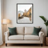 This poster print features a winding road through autumn forest with snow-capped mountains in the background beneath a clear sky. For those who treasure seasonal landscapes. Let forested autumn roads grace your wall. Prints available in A1, A2, A3 and A4 sizes.