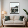 This poster print presents a curved mountain road winding through autumn trees and forested slopes beneath a grey sky. For seekers of seasonal forest drives. Let winding woodland roads enrich your wall. Prints available in A1, A2, A3 and A4 sizes.