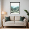 This poster print presents a misty mountain valley with green hills and winding paths framed by forested peaks beneath a pale sky. For those who love tranquil alpine vistas. Bring timeless mountain calm to your wall. Prints available in A1, A2, A3 and A4 sizes.