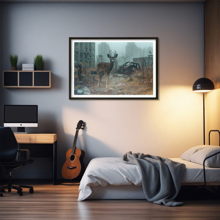 This post-apocalyptic art poster features a lone deer amidst urban debris and abandoned architecture. Perfect for those who love the haunting blend of wildlife and dystopia. Add resilient beauty to your space. Prints available in A1, A2, A3 and A4 sizes.