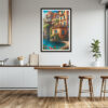 This wall art print captures rustic cliffside houses with blue shutters beside a luminous river, surrounded by vivid flowers. For admirers of Mediterranean charm and rich colour. Bring sun-washed warmth to your wall. Prints available in A1, A2, A3 and A4 sizes.
