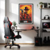 This dramatic gaming poster features a lone gunslinger aiming his revolver, with riders on horseback below and Red Dead Redemption 2 title beneath. For those drawn to frontier tales. Add this powerful design to your wall. Prints available in A1, A2, A3 and A4 sizes.
