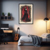 This fantasy art poster portrays a gothic beauty clad in a sweeping black dress, poised before a red ornate background. For admirers of vintage gothic glamour and vampire allure. Let timeless dark elegance adorn your wall. Prints available in A1, A2, A3 and A4 sizes.