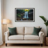 This nature and landscape print captures a graceful waterfall spilling over a rock ledge into a calm pool, encircled by lush green foliage and stones. For lovers of tranquil water scenes. Let flowing beauty grace your wall. Prints available in A1, A2, A3 and A4 sizes.
