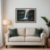 This nature and landscape print features a majestic waterfall plunging down a rocky cliff, surrounded by mossy stones and vibrant greenery with sunbeams above. For waterfall lovers and nature dreamers. Bring dramatic forest charm to your wall. Prints available in A1, A2, A3 and A4 sizes.