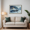 This wall art print shows a wooden cabin perched on a snowy hill amid pines, with falling snow and a frozen waterfall shimmering in the foreground. For those who love winter stories. Bring magical frosted beauty to your wall. Prints available in A1, A2, A3 and A4 sizes.