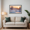 This nature and landscape print features a snow-covered scene with frosted trees, bushes, a shimmering river, and distant hills beneath a glowing sunset sky. For winter lovers and landscape admirers. Bring frosted tranquillity to your wall. Prints available in A1, A2, A3 and A4 sizes.