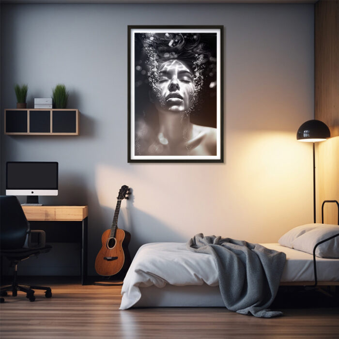 This fantasy art poster shows a woman’s face partially submerged underwater, eyes closed, with bubbles rising around her in a dark, high-contrast setting. Ideal for fans of surreal fantasy and ethereal imagery. Bring a haunting calm to your wall. Prints available in A1, A2, A3 and A4 sizes.